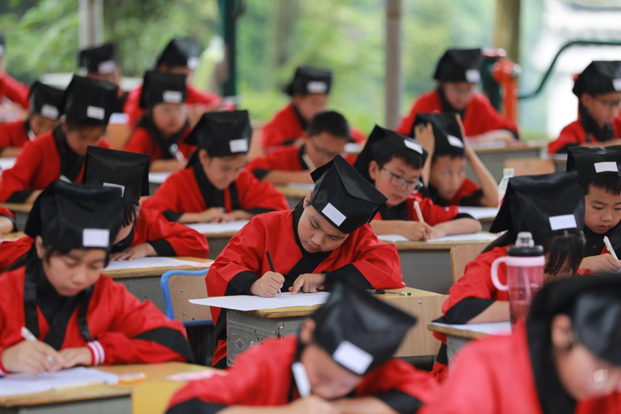 文峰塔下的华父诗词长廊摇身一变成为“临时考场”。随着一声清脆的哨响,“先生”们将精心准备的试卷发放到学生手中。试卷内容丰富,涵盖了魏了翁的生平事迹、理学思想、诗词创作以及他对湖湘文化的贡献等多个方面,全面考查学生们对魏了翁文化的了解程度。