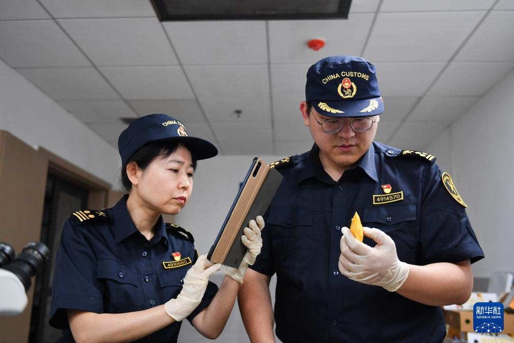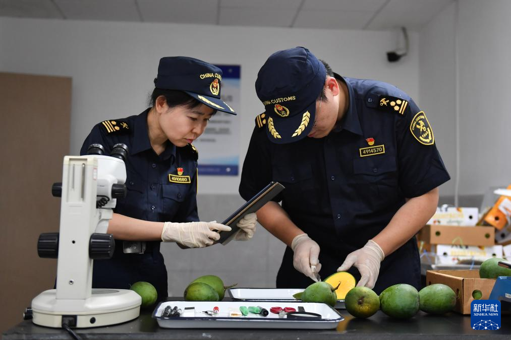 5月28日,长沙黄花机场海关关员对芒果进行感官检查。新华社记者 陈振海 摄pagebreak
