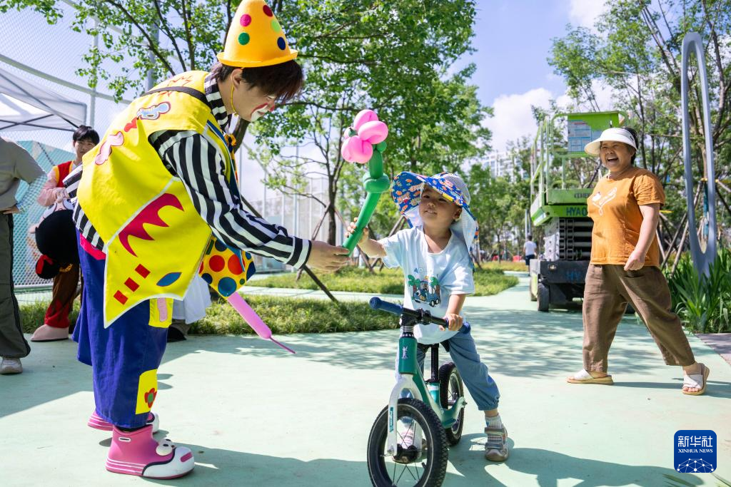 5月30日,在长沙大泽湖近自然湿地公园,工作人员(左一)向游客赠送气球。新华社记者 陈思汗 摄pagebreak
