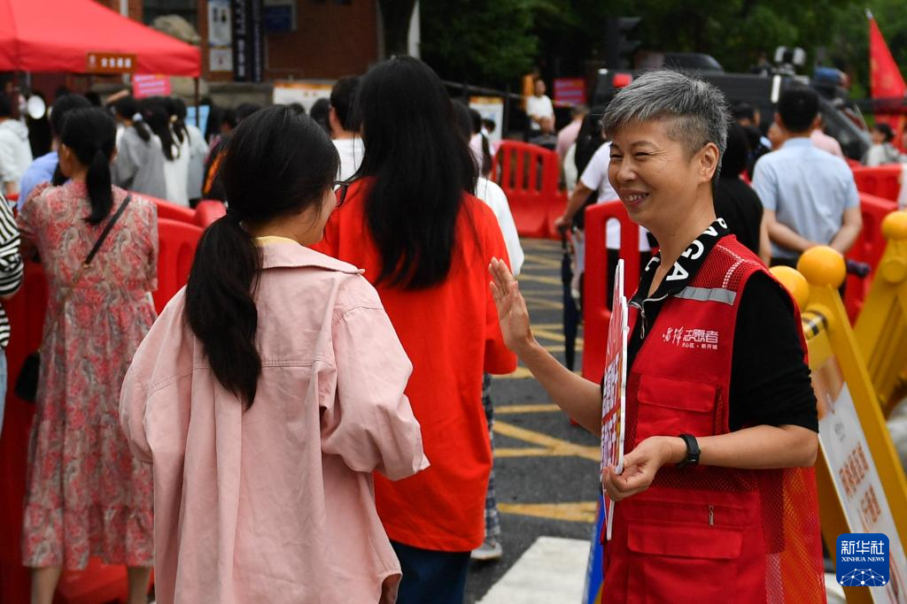6月8日,志愿者在湖南省天心考区明德中学考点外引导考生入场。