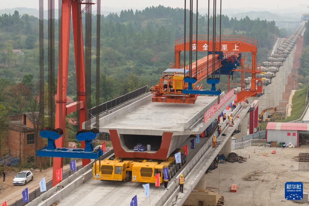 这是10月13日拍摄的邵永高铁跨芦洪江特大桥架梁施工现场(无人机照片)。新华社记者 陈思汗 摄