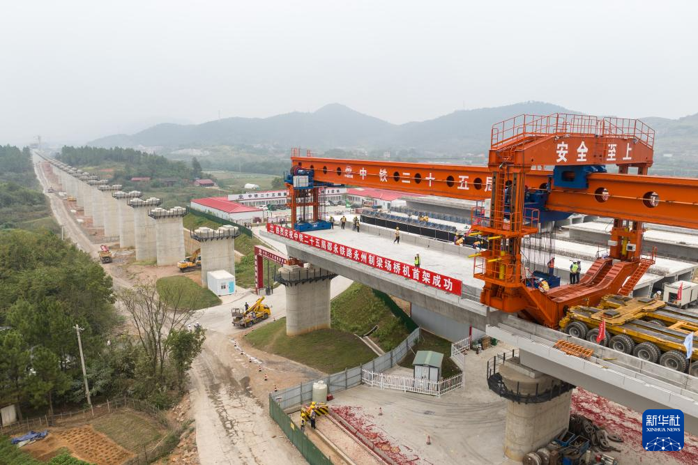 10月13日,在位于湖南省永州市的邵(阳)永(州)高铁跨芦洪江特大桥施工现场,一榀长32.6米、重近817吨的箱梁平稳架设,标志着由中铁二十五局承建的邵永高铁三标正式开始架梁,该条新建铁路进入了架梁施工高峰阶段。