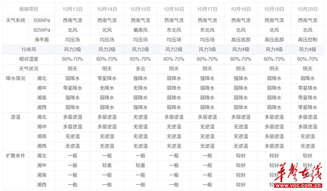 10月14日,受冷空气影响,全省阴天间多云,湘中以南大部分地区有阵雨,局地中雨;北风2~3级,大气扩散条件较好。湘西空气质量为优,其余地区以良为主。