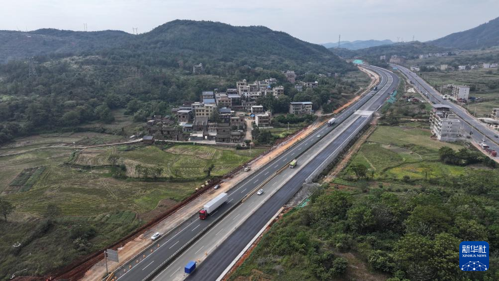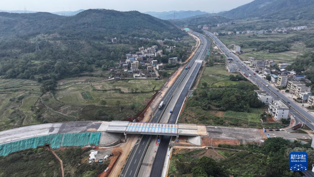 这是10月24日在京港澳高速耒宜改扩建工程宜章段施工现场拍摄的宜章北枢纽互通(无人机照片)。新华社记者 丁春雨 摄
