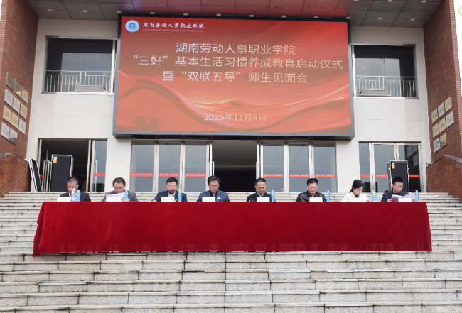11月4日,湖南劳动人事职业学院举行“三好”基本生活习惯养成教育启动仪式暨“双联五导”师生见面会。学院党委书记徐厌平,党委副书记、院长钟秋明,党委副书记李啸川等全体党委班子成员出席大会,与全院教师及大一、大二年级学生共同见证这一时刻。