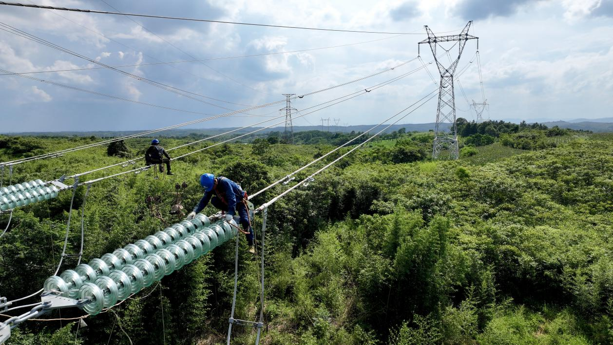 石门电厂三期-澧州220千伏N201至N203附件安装施工现场,施工人员骑着特制的“飞车”穿梭于导线上,并在指定位置安装间隔棒。