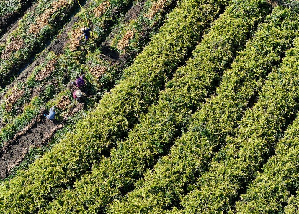 11月24日,郴州汝城县金山村村民在田里收获小黄姜(无人机照片)。