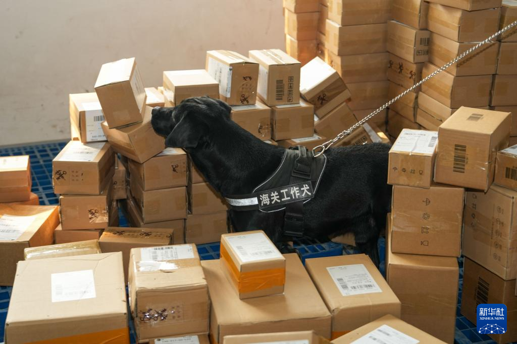 12月10日,海关工作犬在长沙国际邮件互换局查验进口包裹。新华社记者 薛宇舸 摄pagebreak