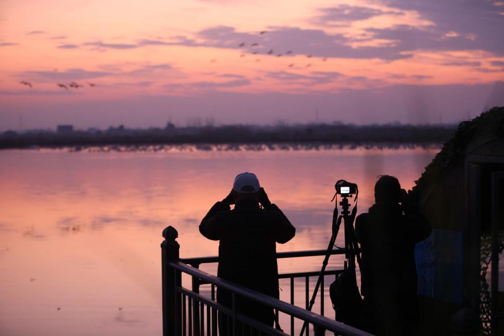 12月16日清晨,游客在东古湖拍摄候鸟。新华社发(周洋 摄)pagebreak
