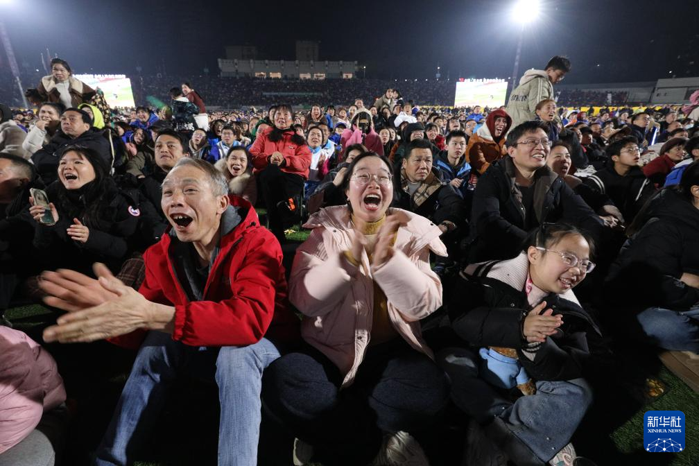 12月27日,球迷在永州市体育场观看“湘超”决赛直播。