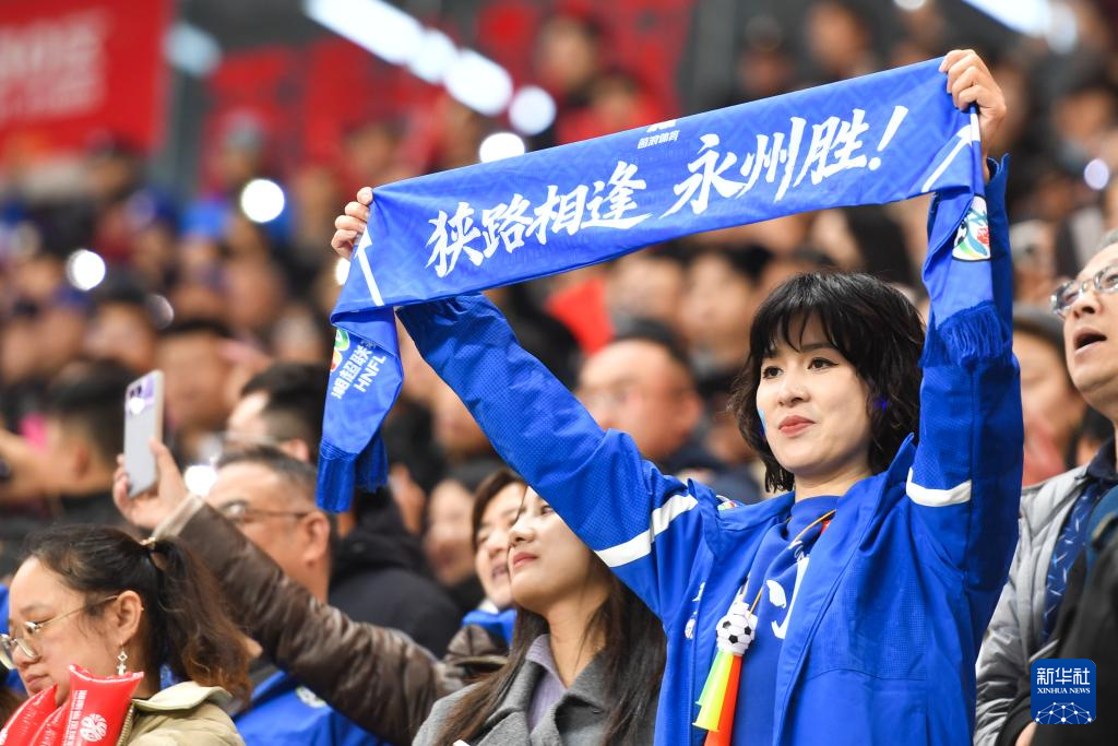 12月27日,球迷在永州市体育场庆祝永州队夺冠。
