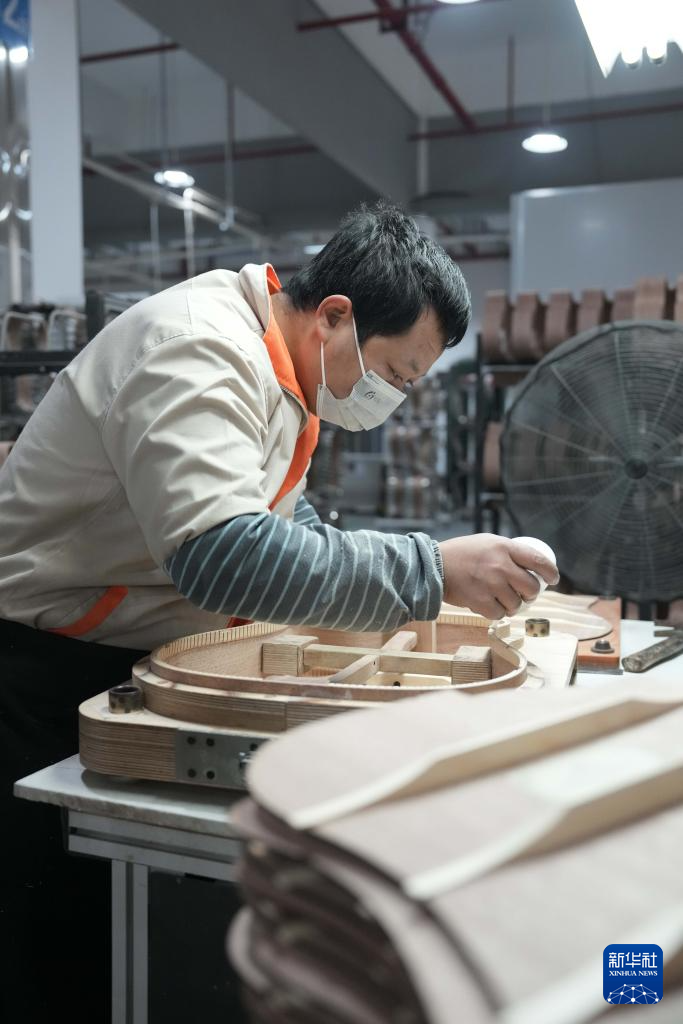 1月7日,工人在位于湖南宁乡的湖南省卡玛乐器制造有限公司生产车间组装吉他。新华社记者 薛宇舸 摄pagebreak
