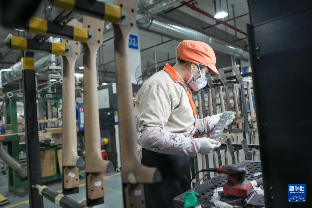 1月7日,工人在位于湖南宁乡的湖南省卡玛乐器制造有限公司生产车间打磨并检查吉他部件。新华社记者 薛宇舸 摄pagebreak