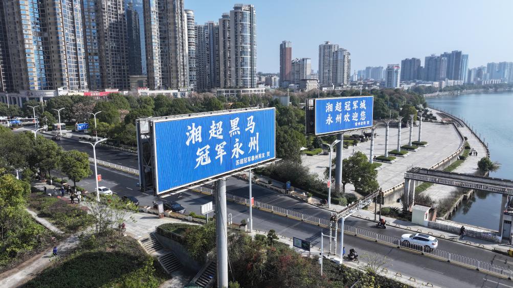“这里是永州,我们是冠军。苏州网友贺”——元旦过后,随着一块“苏籍”祝福广告牌的出现,永州队的故事在江苏传播渐广。此后,永州城区不断涌现来自江苏的祝福——“这里是永州,我们是冠军。多省省会南京网友贺”“湘超黑马,冠军永州。苏超冠军泰州网友贺”“永州是一座美得让人吃‘醋’的城市。镇江十二人球迷汇贺”。