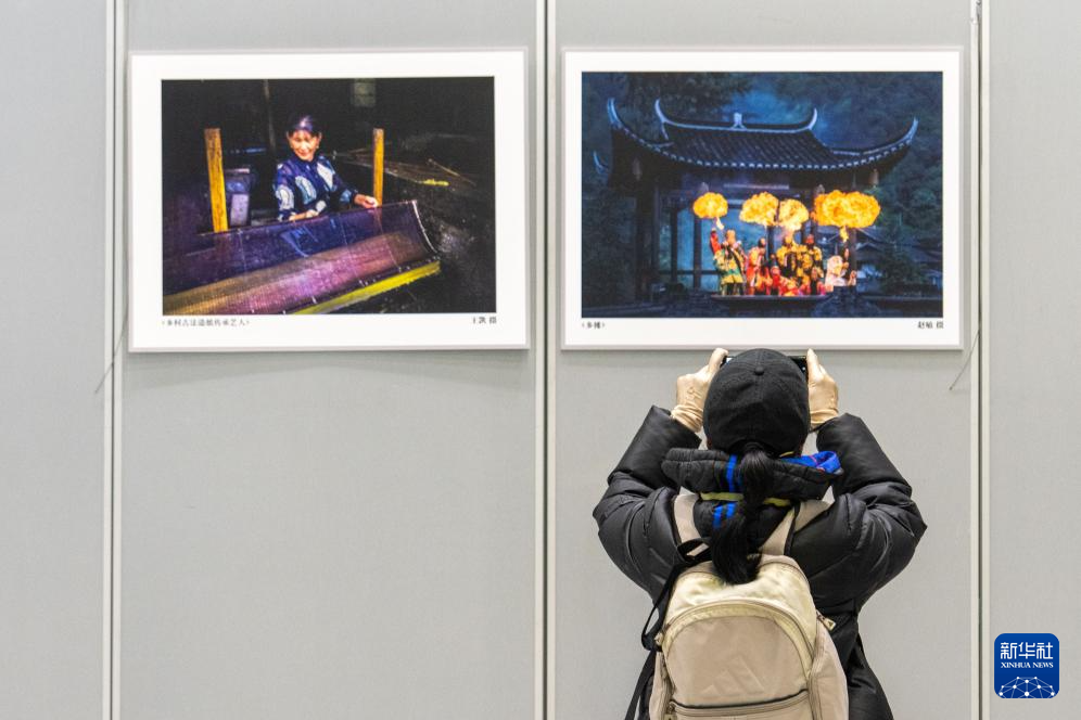 2月6日,市民在湖南省文化馆拍摄展出的摄影作品。新华社记者 陈思汗 摄