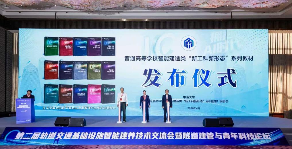 新华网长沙4月23日电(记者谢樱)4月23日,由中国中铁股份有限公司、中南大学主办的“第二届轨道交通基础设施智能建养技术交流会暨隧道建管与青年科技论坛”在长沙举行。大会开幕式上,中南大学出版社出版的“普通高等学校智能建造类‘新工科新形态’系列教材”正式发布。